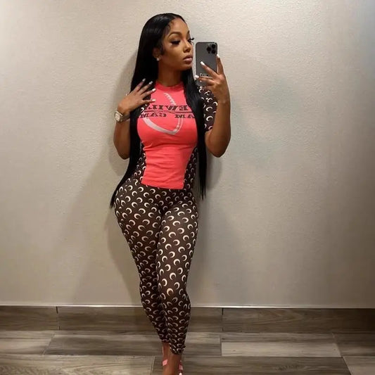 Stretch 2 Piece Set Women Short Sleeve T Shirt Tight Pants Moon Print Slimming Sportswear Sexy Base Fashion