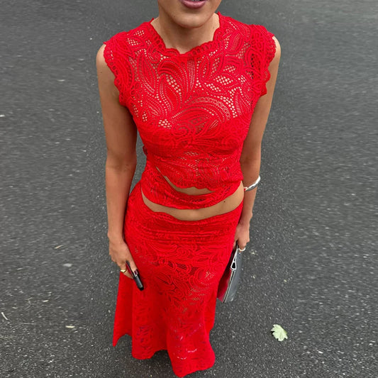 Red Sexy Hook Flower Hollow Lace Set Two Piece Crew Neck Crop Top and Fishtail Skirt Woman Outfit Spring Summer Slim Ladies Suit